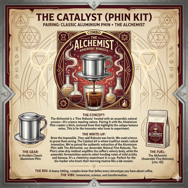 Brew the Impossible. They said Robusta was harsh. We used science to prove them wrong. The Catalyst kit is where tradition meets radical innovation. We’ve paired the authentic extraction of the Aluminum Phin with The Alchemist, our Anaerobic Natural Fine Robusta. The Phin's slow-drip method amplifies the coffee's velvety body, while the anaerobic fermentation unlocks mind-bending notes of mild acidity and banana. It’s a chemistry experiment in a cup. Perfect for the bio-hacker who treats their morning routine like a lab session.